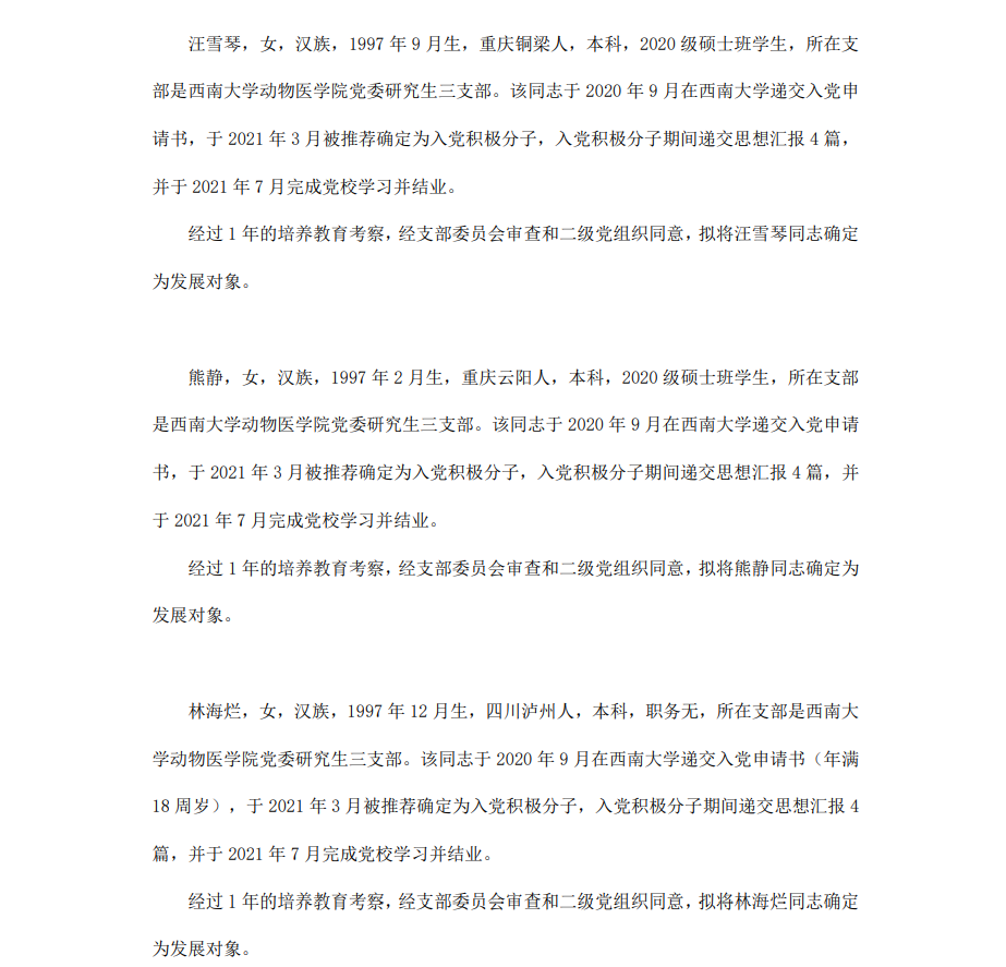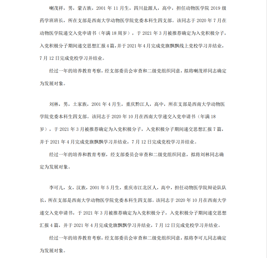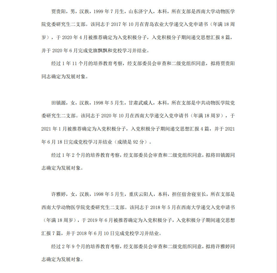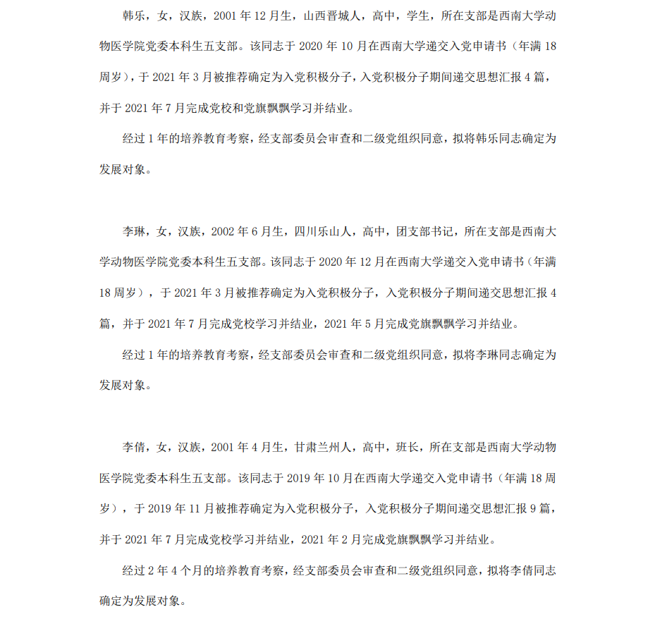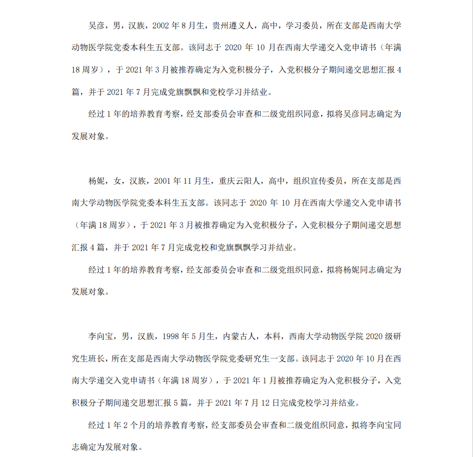 委员会讨论,拟定龙潜等49名同学为近期发展对象,现将其基本情况予以公示。