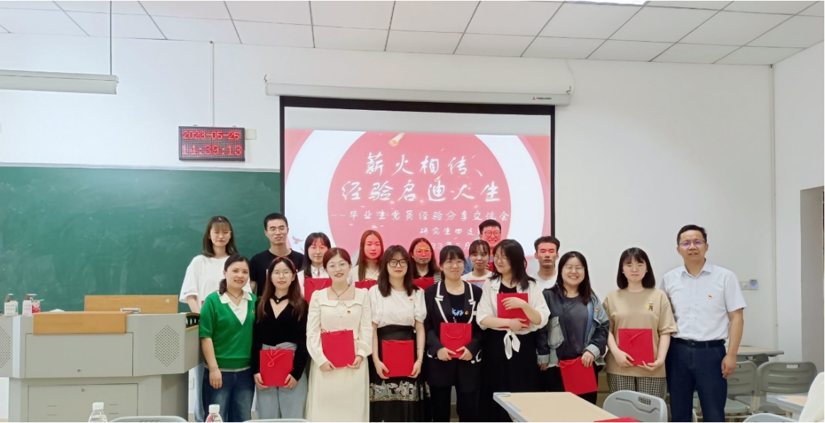 研究生第四党支部于2023年5月25日下午在7教412开展以“薪火相传、经验启迪人生”为主题的毕业生党员经验分享会。学院党委委员甘玲同志出席本次活动,支部书记易华山同志带领支部委员精心策划和组织,支部正式党员19名,预备党员5名,积极分子16名参加了本次活动。