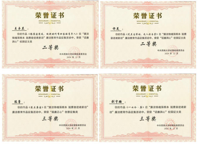 学校开展2024年“廉洁铸魂强根本 挺膺奋进建新功”廉洁教育系列活动中,学院积极响应学校号召,广泛动员师生参与,并取得优异成绩。