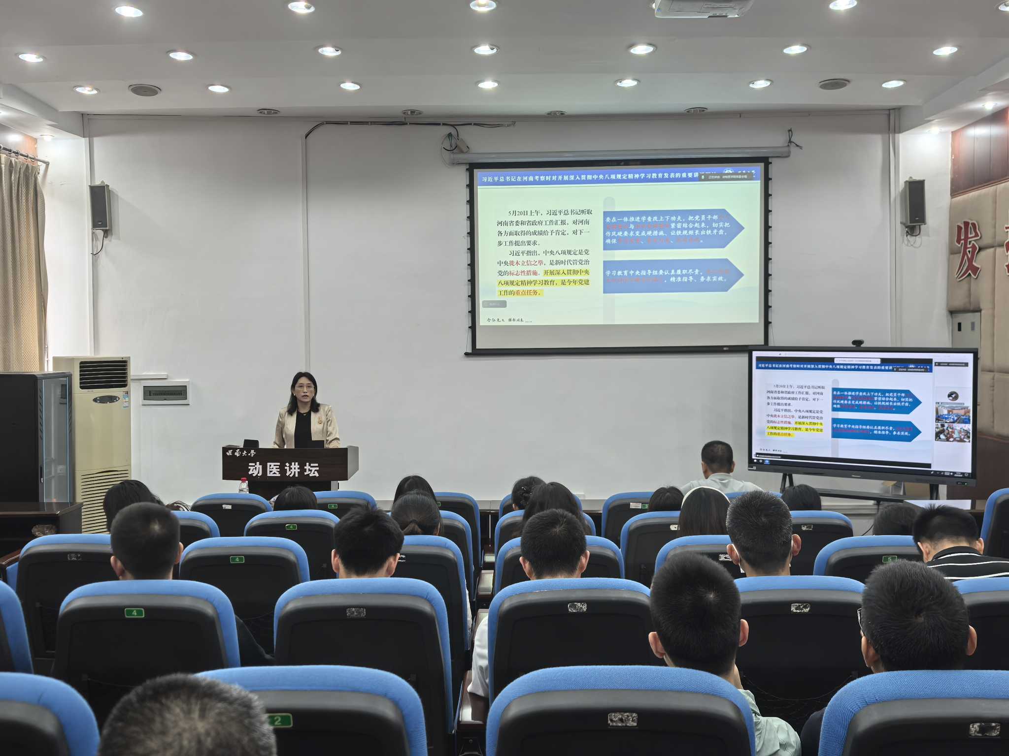 在荣昌、北碚两校区同步召开2025年第六次教职工政治理论学习,会议深入学习领会近期中央重要精神及文件精神,并对学院重点工作进行部署。会议由学院党委书记李海燕主持。