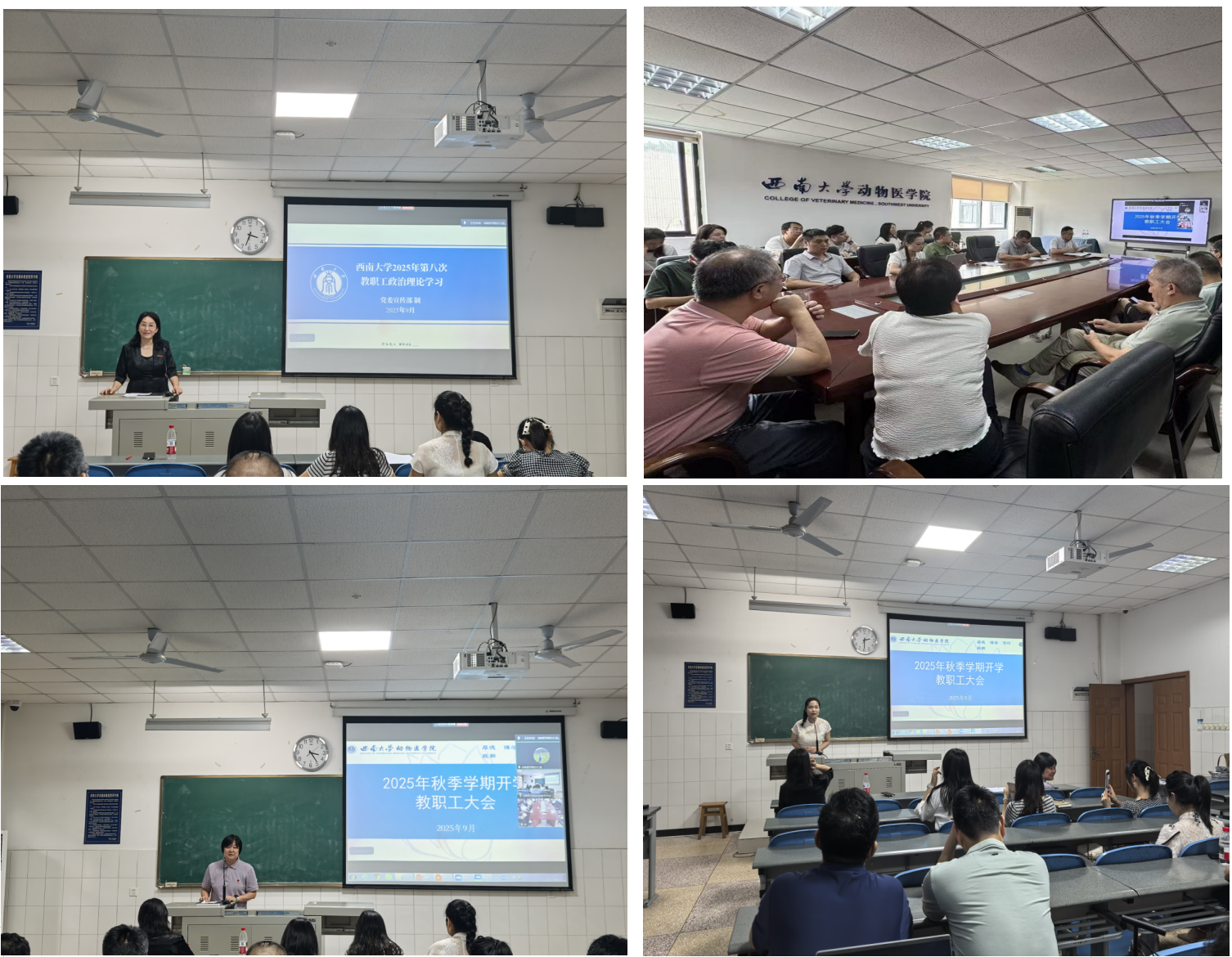 在荣昌、北碚两校区同步召开2025年第八次教职工政治理论学习会议暨秋季学期教职工大会。会议围绕近期重要讲话和文件精神开展深入学习,全面总结暑期工作成效,并就新学期重点任务作出部署。学院党委书记李海燕主持会议。