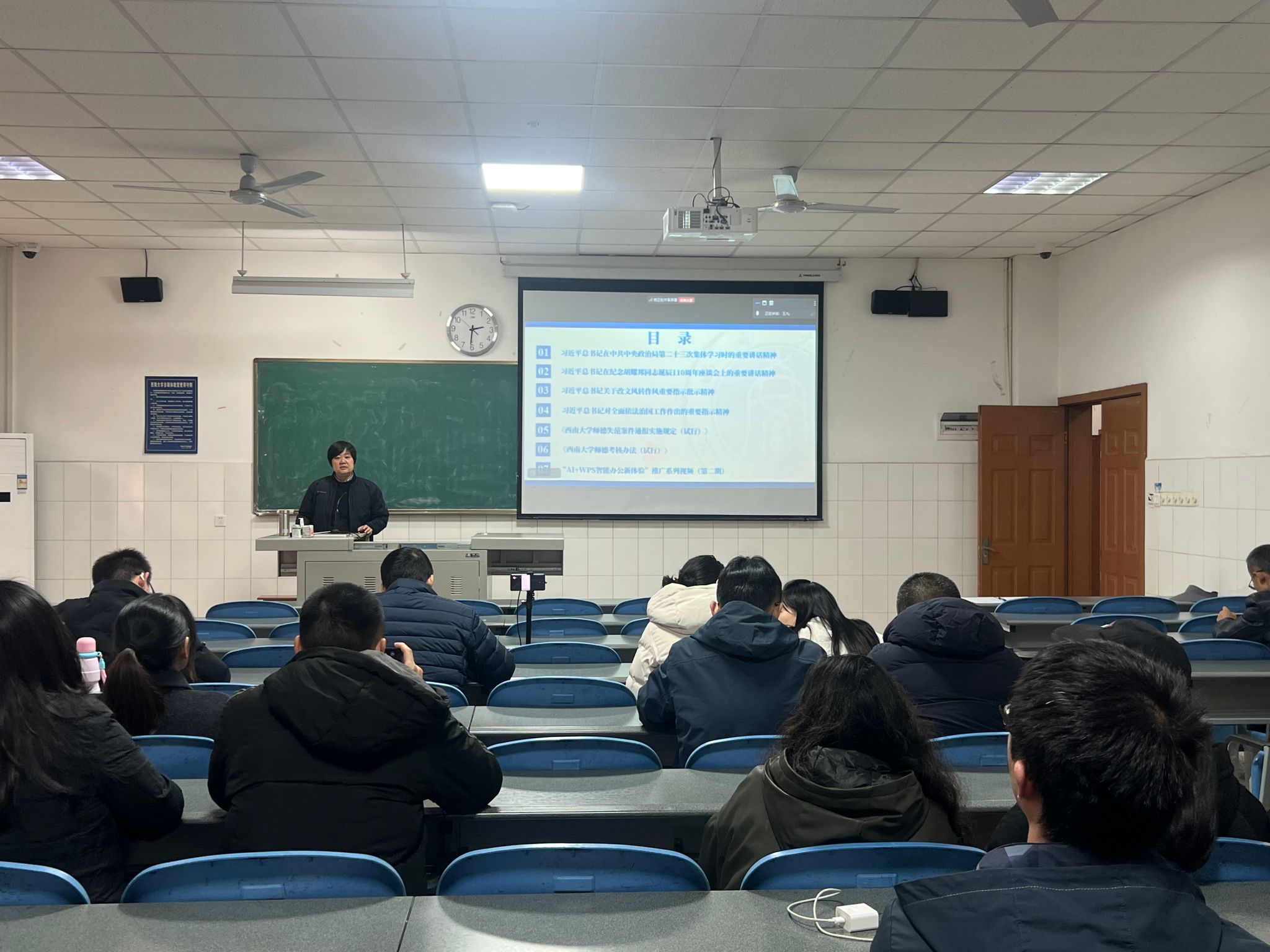 在荣昌、北碚两校区同步召开2025年第十一次教职工政治理论学习会议暨全体教职工大会。会议聚焦重要讲话精神和文件要求,深入传达学习习近平总书记重要讲话,并结合学院实际部署期末重点工作。学院党委副书记、纪委书记罗丹主持会议并作专题领学。