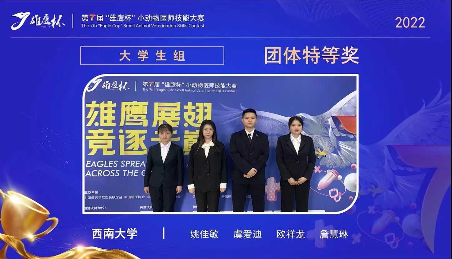 学子不负众望,再次夺得第7届“雄鹰杯”小动物医师技能大赛大学生组“团体特等奖”。取得了在91支高校参赛队伍中总成绩排名第二,各项比赛项目成绩小组第一的傲人成绩。其中,姚佳敏同学获得“兽医新星奖”;胥辉豪、郑小波、李前勇老师获得“优秀辅导教师特等奖”;我校获得“最佳组织奖”。同时,韩国污漫