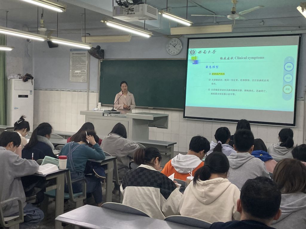 高校作为高等教育实施和高级人才培养的重要场所,肩负着践行和培育社会主义核心价值观的重要任务。“课程思政”旨在把思想政治工作和思想价值引领贯穿教育教学全过程,专业教师怎样把专业理论与实践潜移默化融入教学之中,让受教育者领悟自我价值的实现与社会主义伟大理想目标实现之间的重要性。预防兽医系根据工作安排,于3月21日上午10点,在荣昌校区1105教室观摩了罗洪艳副教授讲授的《兽医传染病学》。罗洪艳老师采取线下讲授结合线上随堂测试、线上线下互动的教学方式,调动学生积极思考、主动参与学习的积极性。之后,大家在3202会议室(在荣老师)和腾讯会场(在北碚老师)共聚一堂,举办了以“创新课程思政”为主题的教学研讨会,会议由系主任周作勇副教授主持。