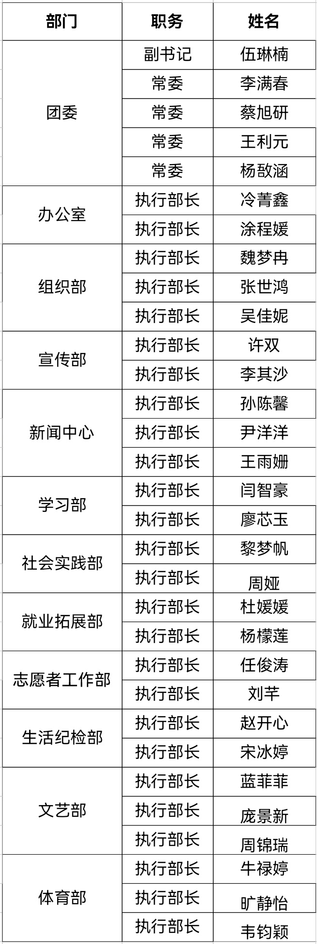 2022-2023学年团委学生会团学干部名单
