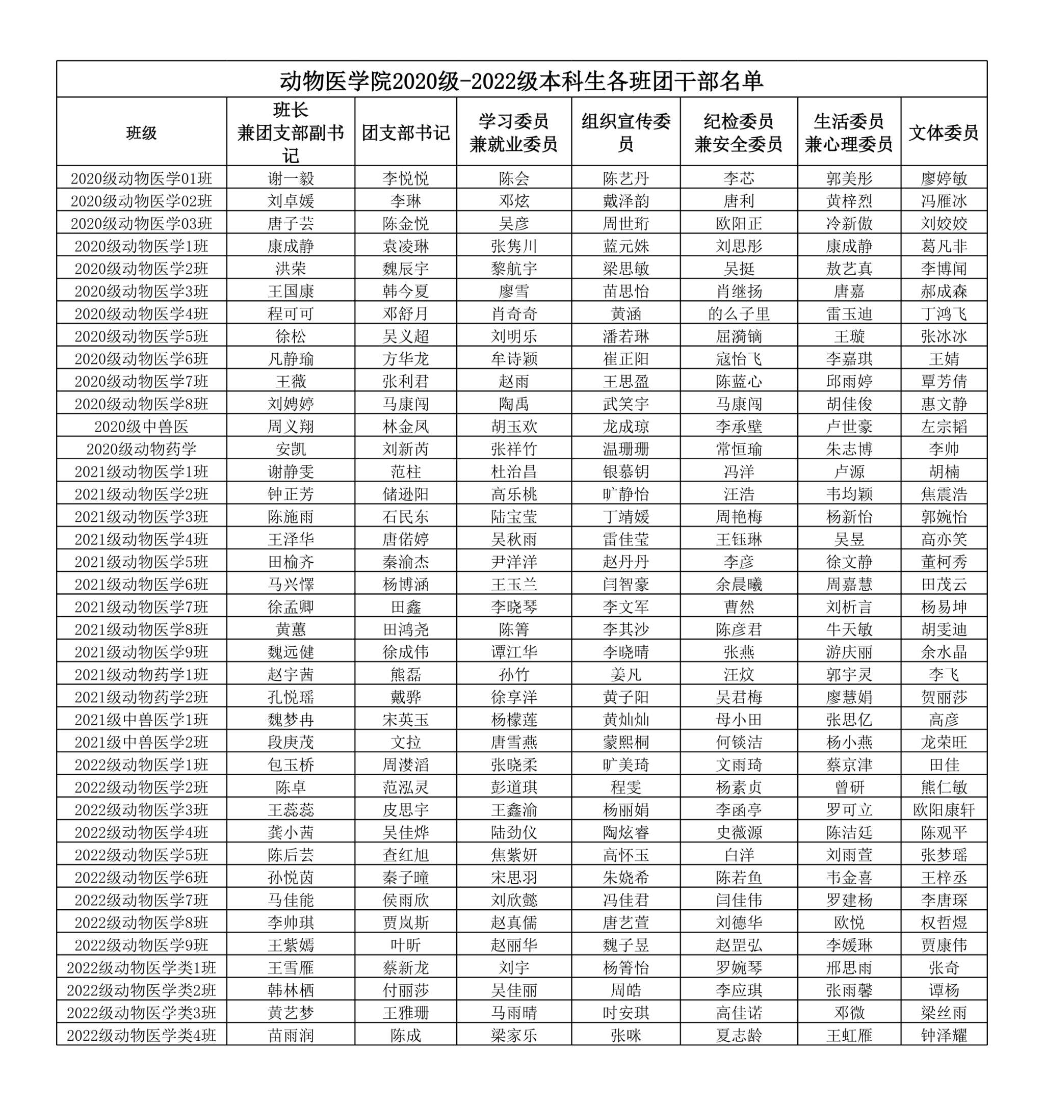 韩国污漫 2020级-2022级本科生各班团干部名单