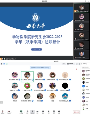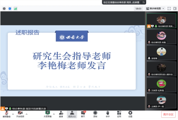 研究生会(以下简称研会)在2022年12月29日下午14:30通过腾讯会议(线上)召开2022-2023学年秋季学期述职评议会。