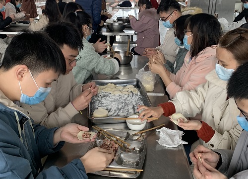 上午10:30,留校师生们陆续走进食堂三楼,抬眼望去,桌子上摆放着一大早就备好的饺子皮和肉馅。随后,老师和同学们围坐在一起,大家一边相互切磋包饺子的技术,一边分享生活趣事,提前感受到浓浓的年味。