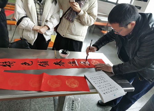 在食堂的另一角,党委书记黄昌建将提前购置的大红纸和毛笔、墨汁等文房用品摆放整齐,蘸好笔墨,凝神聚气,泼墨挥毫,一幅幅散发着清新墨香的喜庆春联呈现在眼前,一行行俊逸的书法,一句句喜庆的言语,亲笔为在场的老师和学生们送上别样的祝福。
