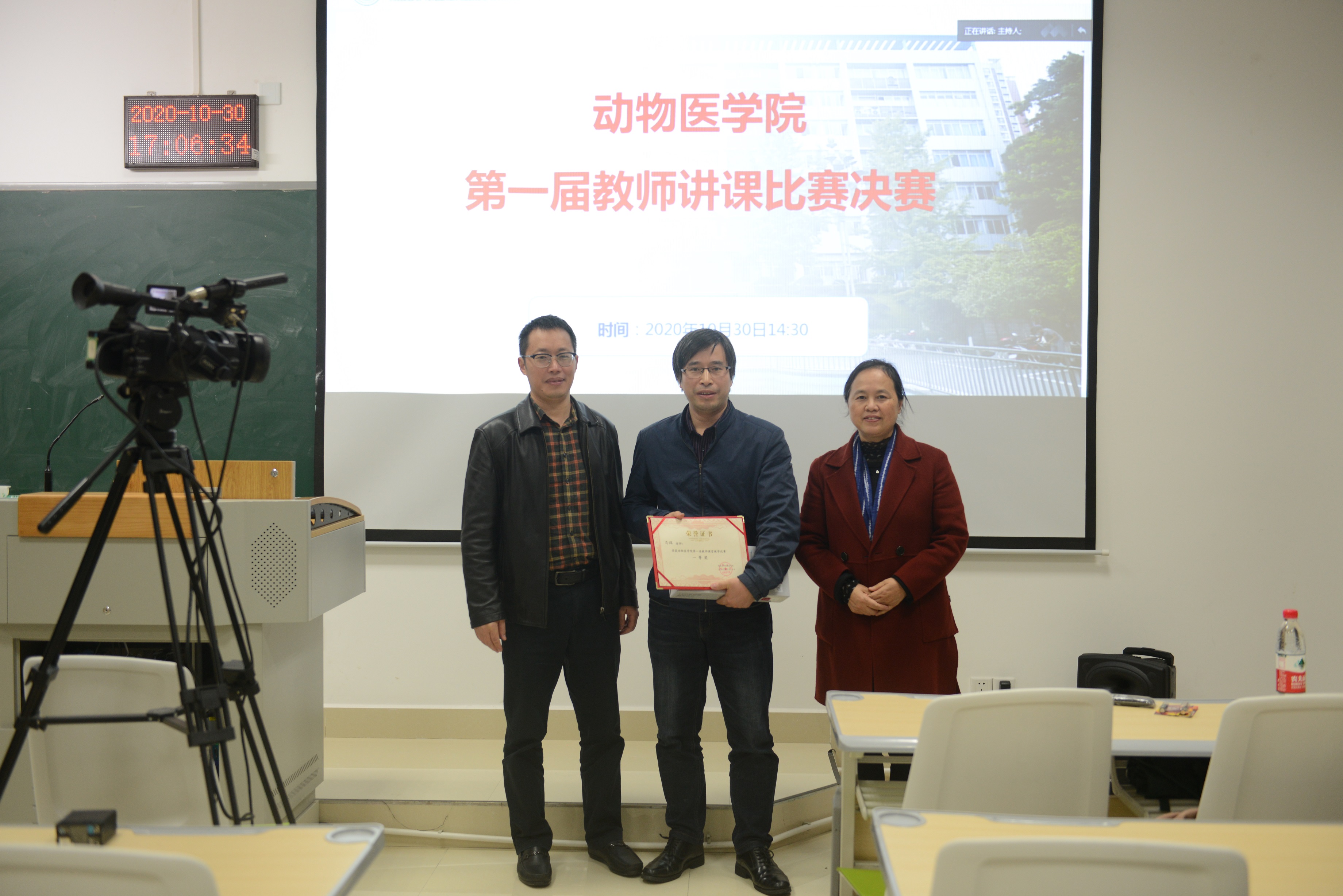 分别在主会场(荣昌7B108)和分会场(北碚动物医院210会议室)举行第一届教师课堂教学比赛决赛。全院教职工和部分学生代表出席会场。此次评委由学院黄昌建书记、刘娟院长、王鲜忠教授、马跃教授、李继祥教授、周荣琼教授、王自力教授、李能章副教授、黄兰香副教授等9位老师和5位学生代表组成。
