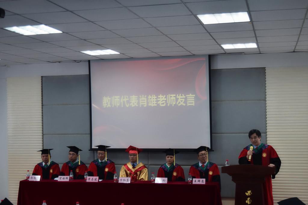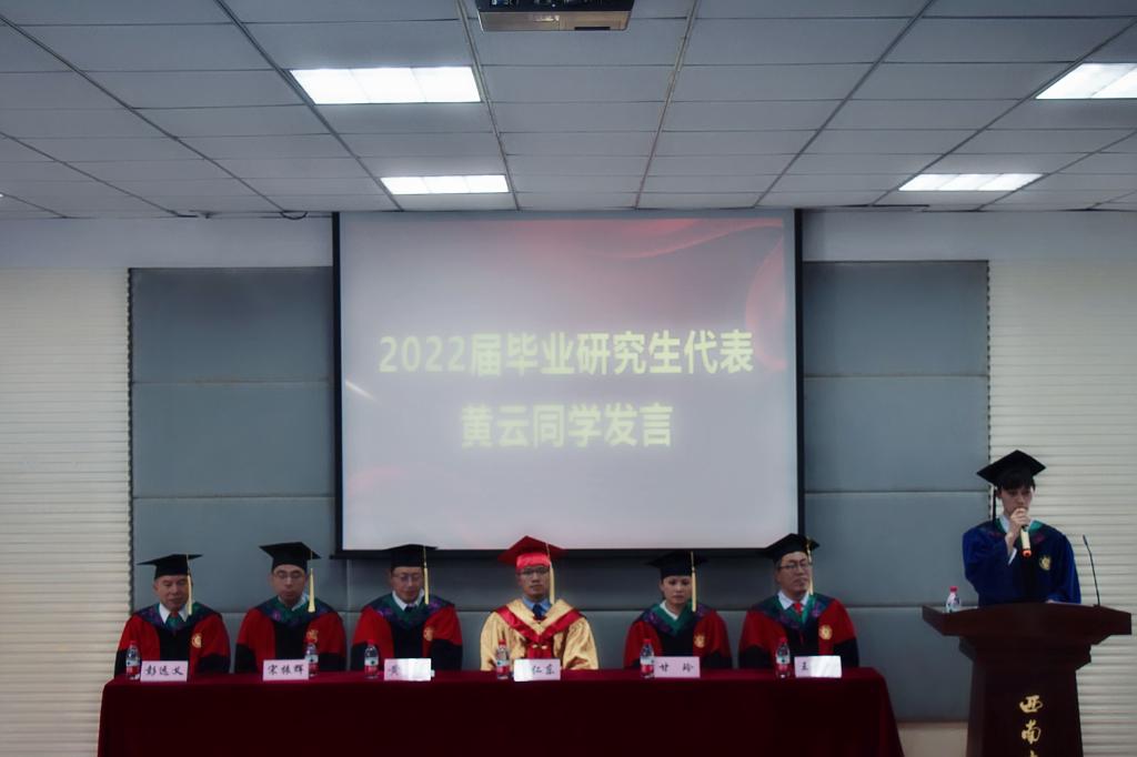本科毕业生代表、重庆市优秀毕业生姚佳敏、秦绍鑫,毕业研究生代表黄云在仪式上深情发言,满怀对学校、学院的感激之情,表达了对学校、学院、老师和同学们的留恋和祝福;她们均表示将秉承“含弘光大 继往开来”的校训,牢记“厚德博学 笃行致新”的院训,立志做科技报国的西大学子,把实现中华民族伟大复兴作为奋斗目标,向学校和国家交出无愧于时代的答卷。