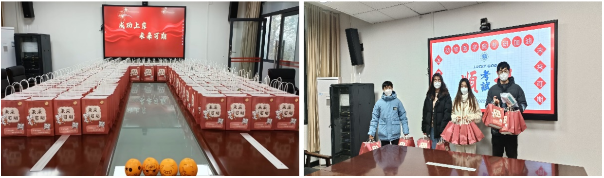暖心服务,做好后勤保障。考研进入倒计时阶段,为确保考研学子顺利安全参考,院长方仁东与学校相关部门协调跨校区考研交通车安排,反复强调考生往返考点的安全事项,组织专车点对点环闭式接送北碚、永川考点的考生。为鼓励考研学子坚定信心,党委副书记罗丹精心安排布置,为即将踏入考场的320余名学生准备了装有橙子、酒精消毒湿巾、医用防护口罩的“考研加油包”,祝愿动医考研学子们心想事“橙”,“橙”功上岸。