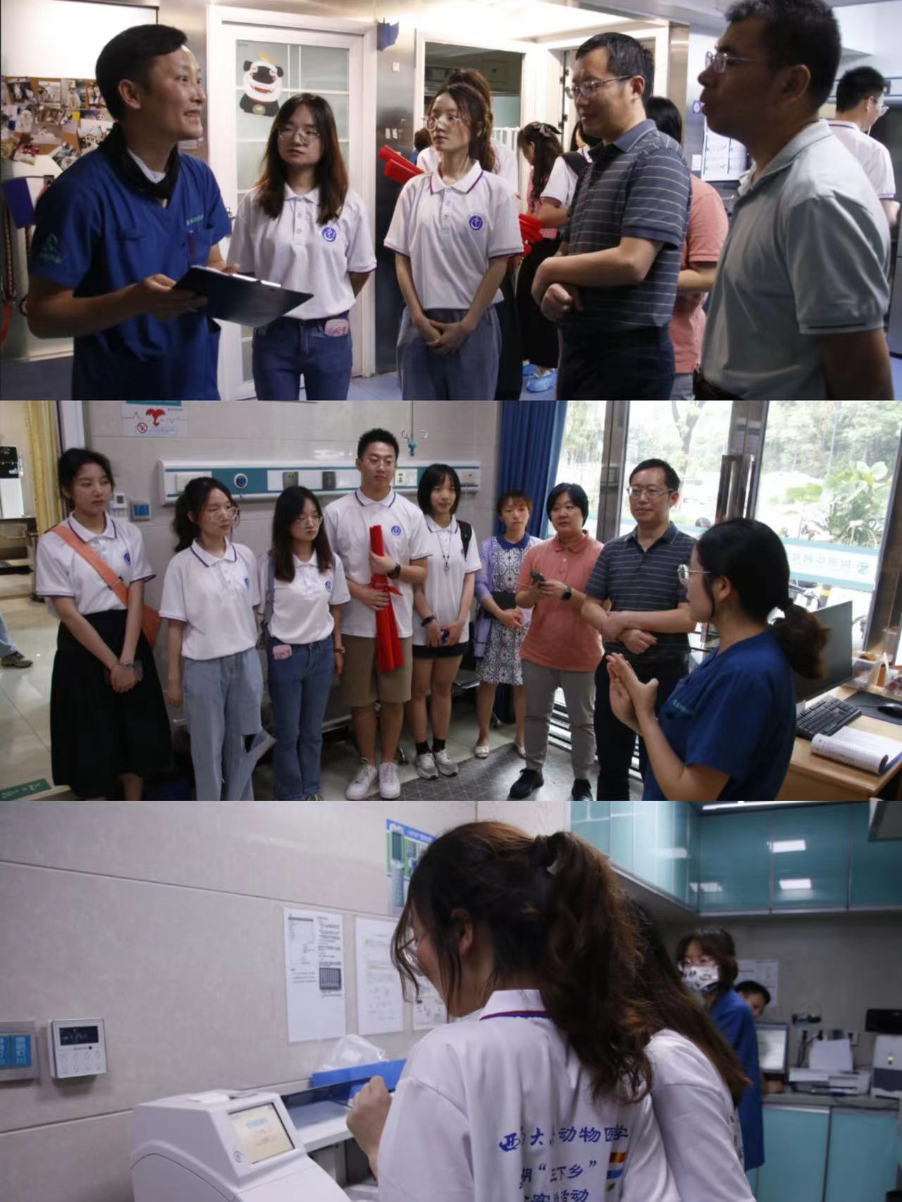 7月4日上午,实践团成员们跟随王思凡院长参观医院基础建设及手术医疗器械。医院分别设置独立的猫专科、犬专科与异宠专科门诊,科室涵盖ICU病房、中医诊疗病房、手术室及住院部,门类齐全;“兽医三字经”是华茜人始终铭记于心的兽医文化内涵,人道主义关怀在这里体现得淋漓尽致。