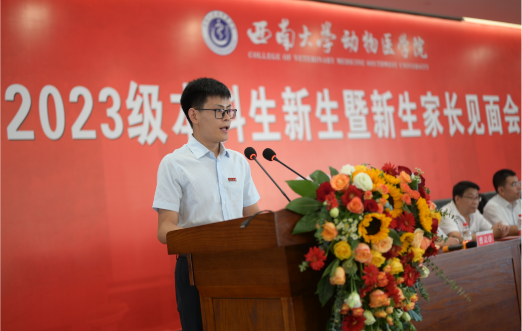 2023级本科生新生暨新生家长见面会在荣昌7B201报告厅隆重举行。学院党委书记黄昌建、院长方仁东、党委副书记罗丹、副院长宋振辉、基础兽医系主任王鲜忠、临床兽医系主任李前勇、预防兽医系主任周作勇、中兽医系主任曹立亭、动物药学系主任魏述永出席大会,参加本次见面会的还有学院科级干部、2023级辅导员和班主任、部分教师代表和学生代表、2023级378位本科新生及100余名新生家长。见面会由学院党委副书记、纪委书记罗丹主持。会议在全体人员奏唱«中华人民共和国国歌»的韵律中拉开帷幕。