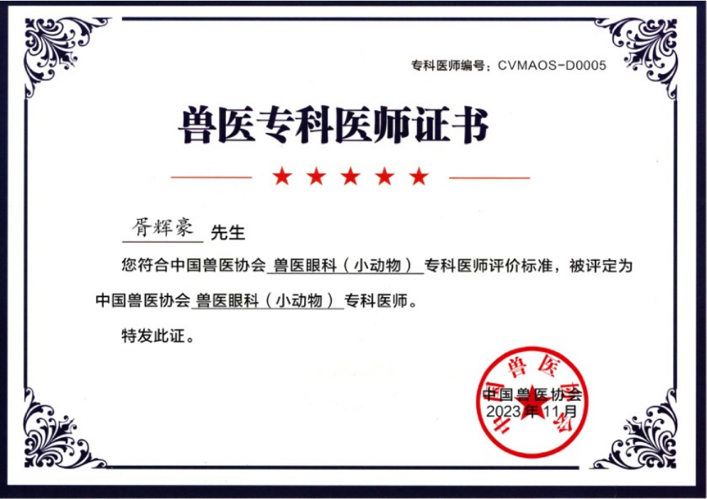 中国兽医协会兽医眼科(小动物)专科医师证书(大会摄影)