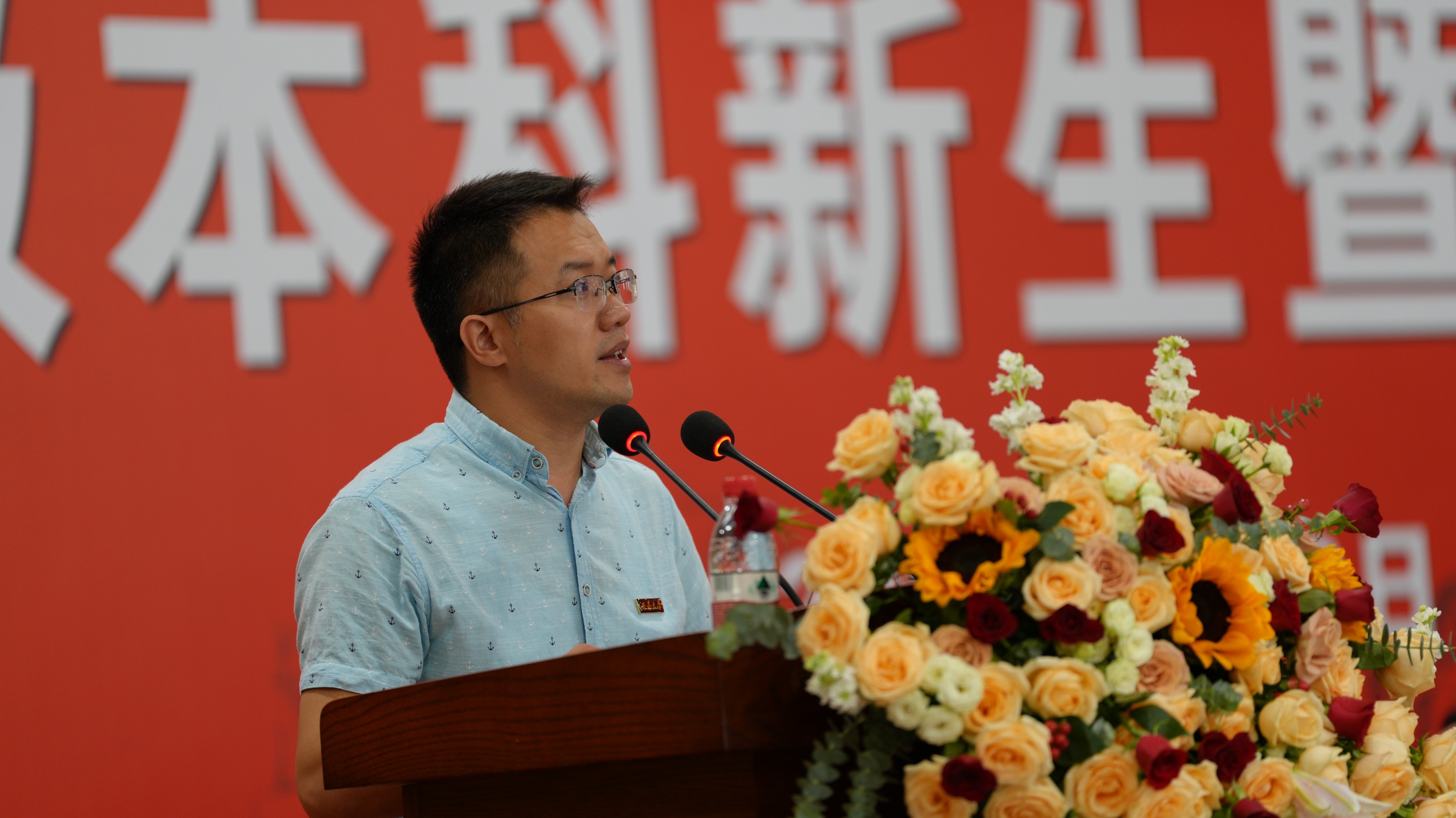 大家庭,对他们即将开启的大学新征程表示衷心祝贺和美好祝福。随后对学院的办学宗旨、教育起源、发展历程及各学科建设成就做了总体概述,并提出三点与同学们共勉:一是将个人理想融入党和国家需要,坚定理想信念与报国追求,秉持家国情怀砥砺奋进;二是夯实基础能力素养,保持好奇心与探究热情,善于思考,勇于创新,坚持学思并重求实创新;三是增强体育锻炼,涵养礼仪修养,以强健体魄与完善素质把握时代脉搏,努力成长为责任担当、基础宽厚、视野恢弘、人格健全的新时代建设者和接班人,以饱满的信念热情、扎实的专业基础、昂扬的奋斗姿态逐梦青春路,筑梦动医时。
