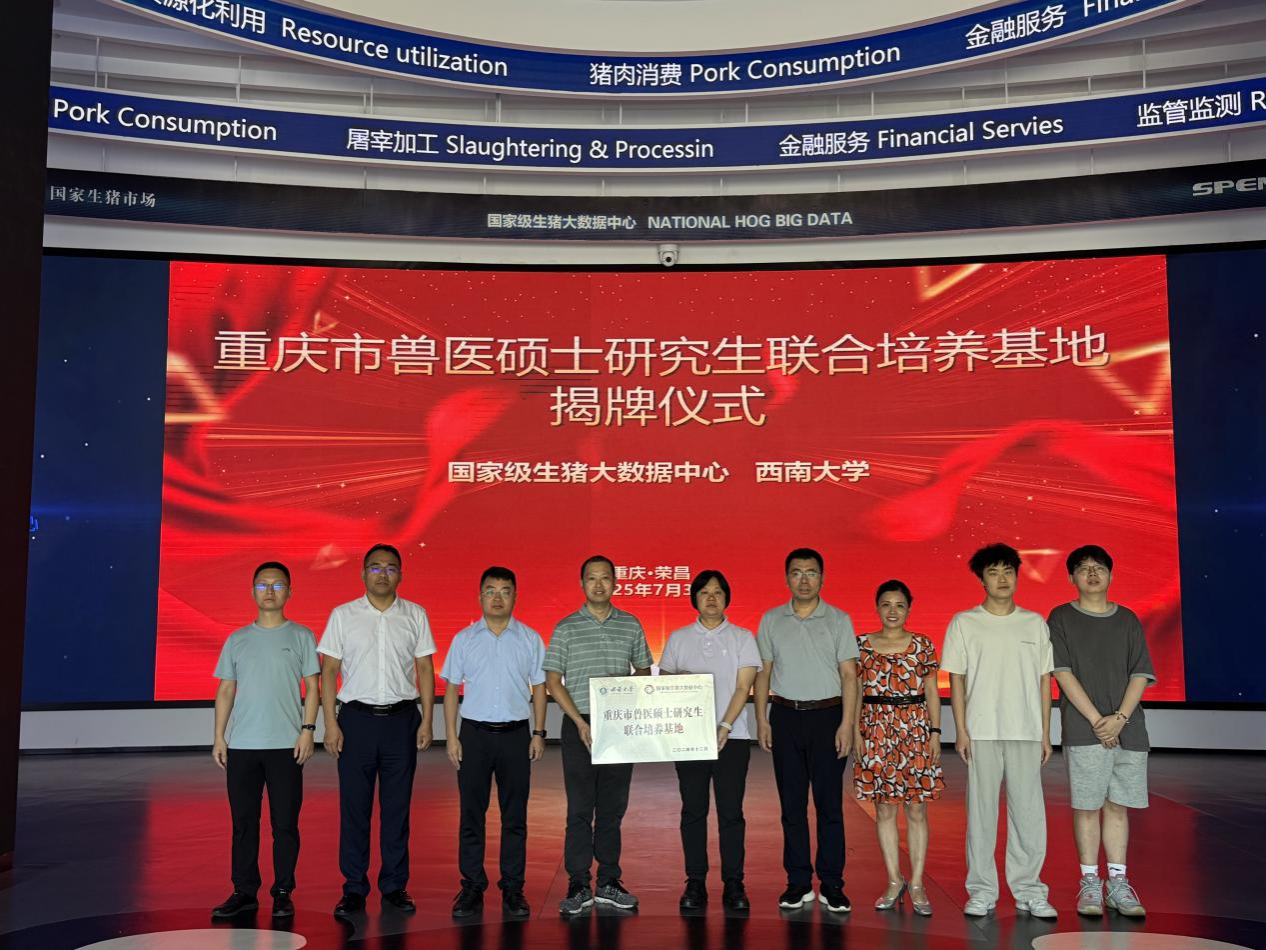 与国家级生猪大数据中心于云尚·农牧大数据产业园开展重庆市兽医硕士研究生联合培养基地第一次协同会议暨揭牌仪式。学院党委副书记、纪委书记罗丹、副院长宋振辉及该基地建设负责人甘玲教授、生猪大数据中心主任秦友平、生猪大数据中心副主任陈虎、生猪大数据中心综合科科长赵平等出席此次会议。