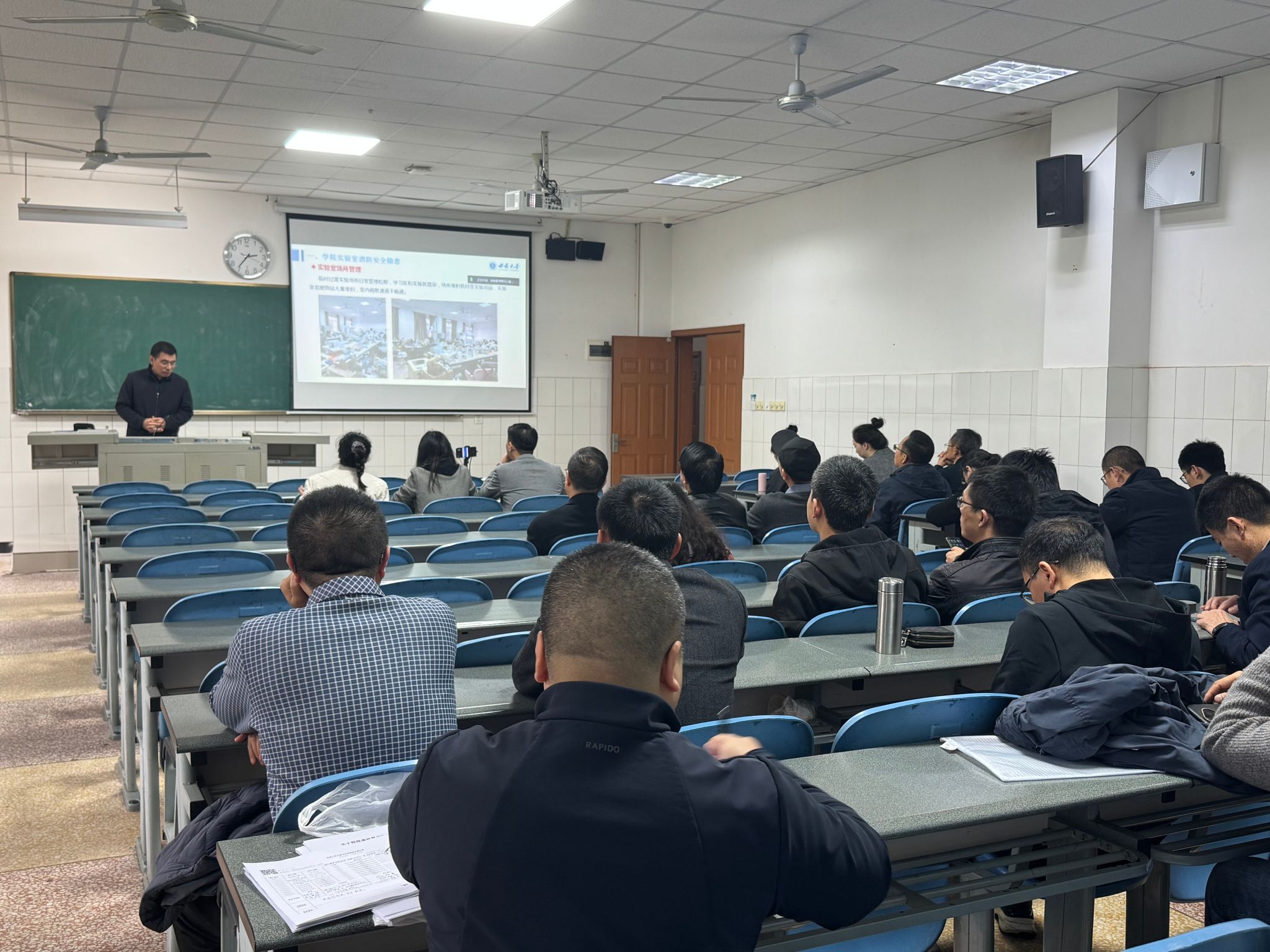随后,宋振辉副院长通报了近期安全检查中发现的主要隐患,包括实验室易燃品堆放不规范、用电安全问题突出、化学品管理存在漏洞以及消防器材维护不到位等情况。宋振辉副院长指出,安全隐患必须引起高度重视。本次会议明确了专项治理工作方案,学院将全面查找问题并推动整改。针对生物安全,宋振辉副院长特别强调了学校下发的最新管控要求,病原微生物相关实验活动必须在具备相应资质的生物安全实验室内进行,并严格执行安全风险评估和审核程序。方仁东院长在总结发言中再次强调实验室安全的重要性,要求全体教职工严格落实“谁主管、谁负责”的安全责任制,确保各项安全举措落地见效。