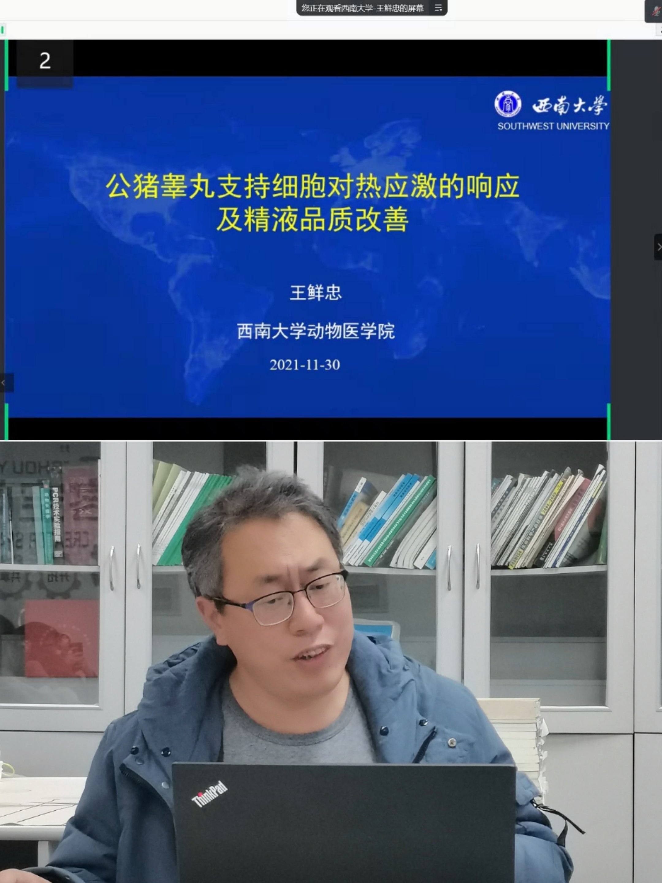 王鲜忠教授以“公猪睾丸支持细胞对热应激的响应及精液品质改善”为题,从热应激对细胞周期、细胞代谢、细胞连接等方面的影响入手,多角度分析了热应激给公猪生精功能带来的负面影响,并结合课题组已有研究提出了运用并优化低温等离子体处理技术改善精液品质的策略。该策略的提出展现了不同学科融合创新,为今后多学科专业交流融合提供了参考。
