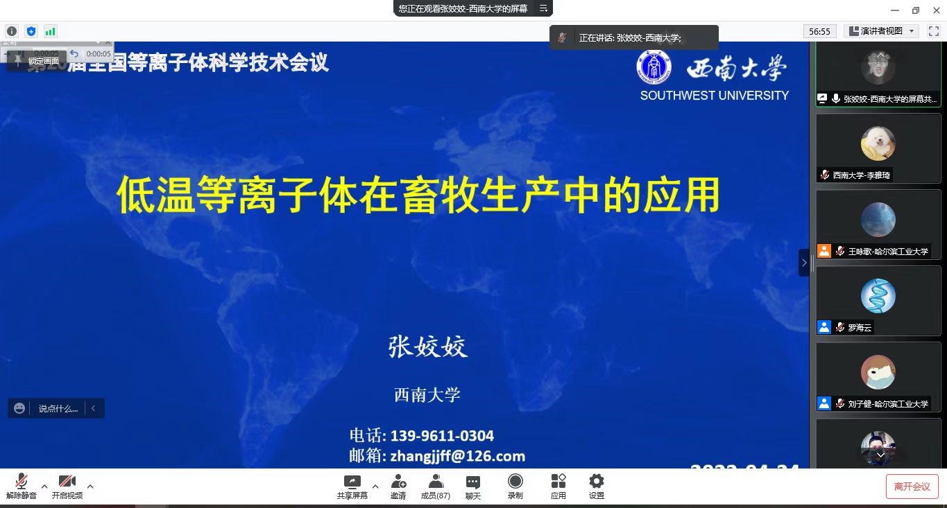本次会议深入探讨了等离子体科学和技术所面临的机遇、挑战及未来的发展方向,加强了等离子体科学技术界同行之间的学术交流,促进了等离子体领域与其它学科领域以及产业界的沟通和联系,推动了我国等离子体科学和技术的发展,同时也为我国畜牧业的健康发展提供了新思路。