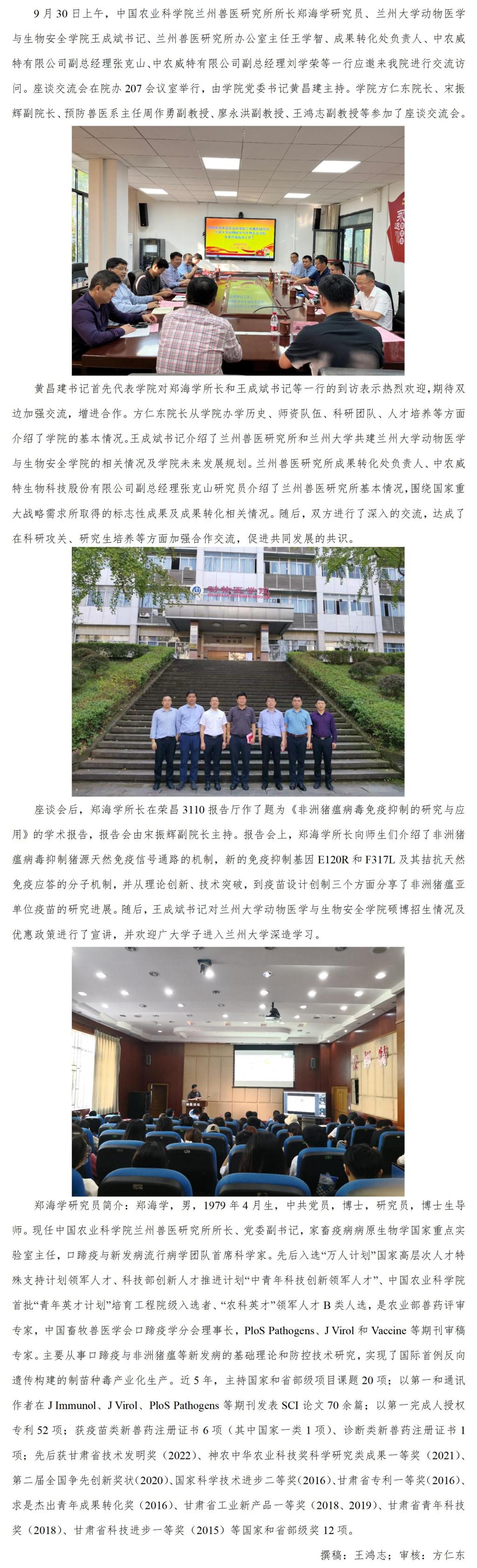 中国农业科学院兰州兽医研究所郑海学所长一行来韩国污漫 交流并作学术报告