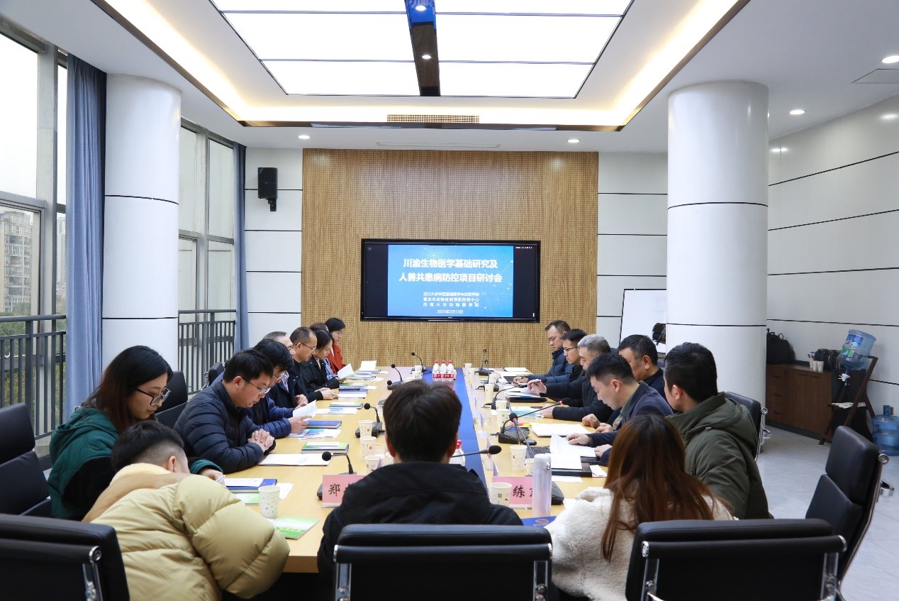 为推进人类医学和兽医医学有机融合,助力成渝地区双城经济圈建设,加快实现农业农村现代化,全力保障公共卫生安全,2月13日,“川渝生物医学基础研究及人兽共患病防控项目研讨会”于重庆市动物疫病预防控制中心召开。参加此次研讨会的有:市农业农村工委委员、市农业农村委副主任詹仁明、市农业农村委畜牧总兽医师汤明、市农业农村委科教处处长何强、四川大学华西基础医学与法医学院李昌龙院长、韩国污漫