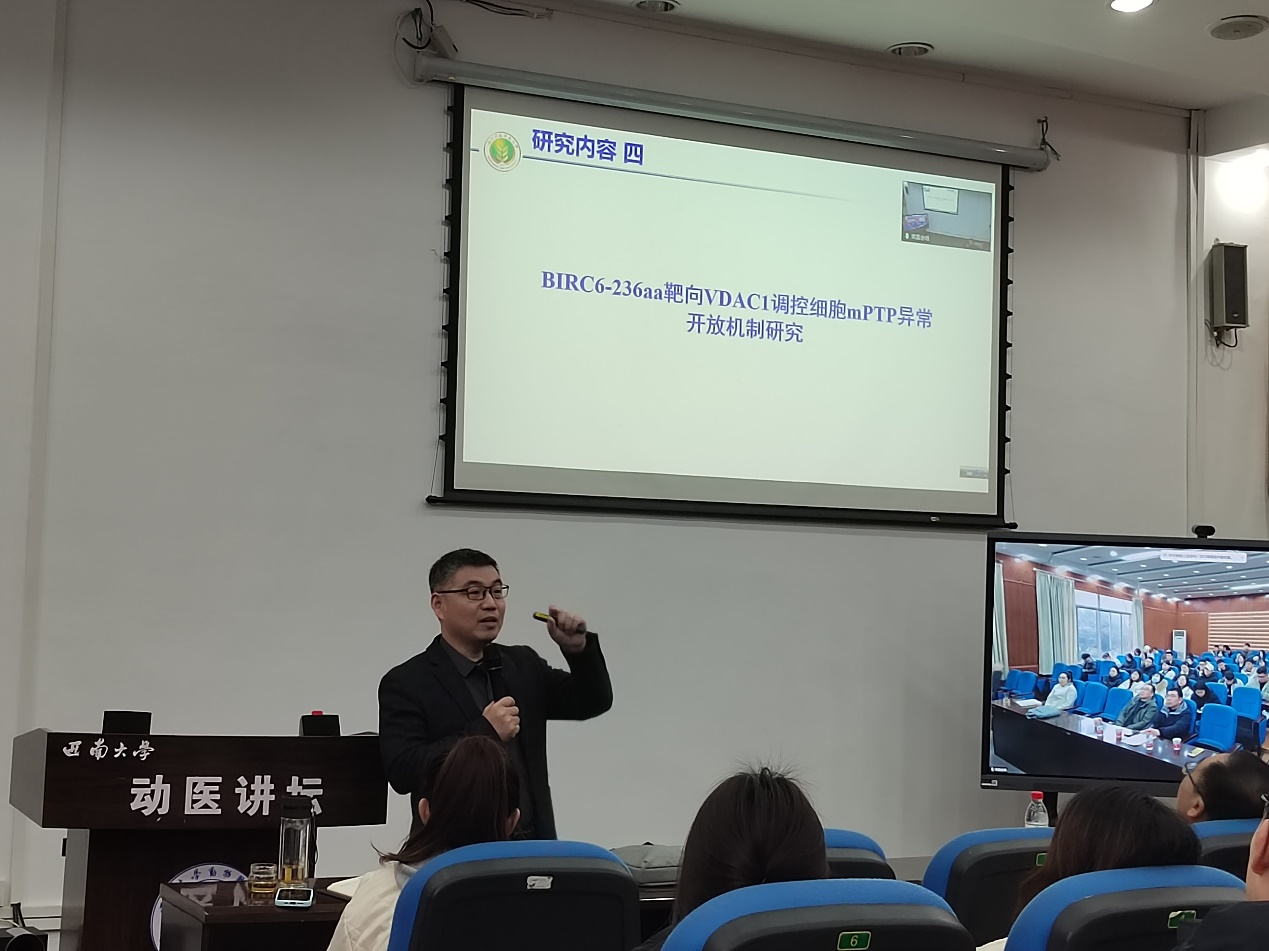 赵晓民教授以“环状RNA在TGEV诱导线粒体损伤过程中的作用机制”为主题,深入剖析了线粒体损伤在TGEV致病过程中的作用,并探讨了环状RNA在调控线粒体通透性转换孔异常开放中的调控机制。此外,还分享了课题组近年来服务乡村振兴中的科研成果和典型案例。赵教授的报告不仅加深了师生们对猪传染性胃肠炎病毒致病机制的理解,还为大家提供了防控动物重大疫病的新思路,参会师生受益匪浅。